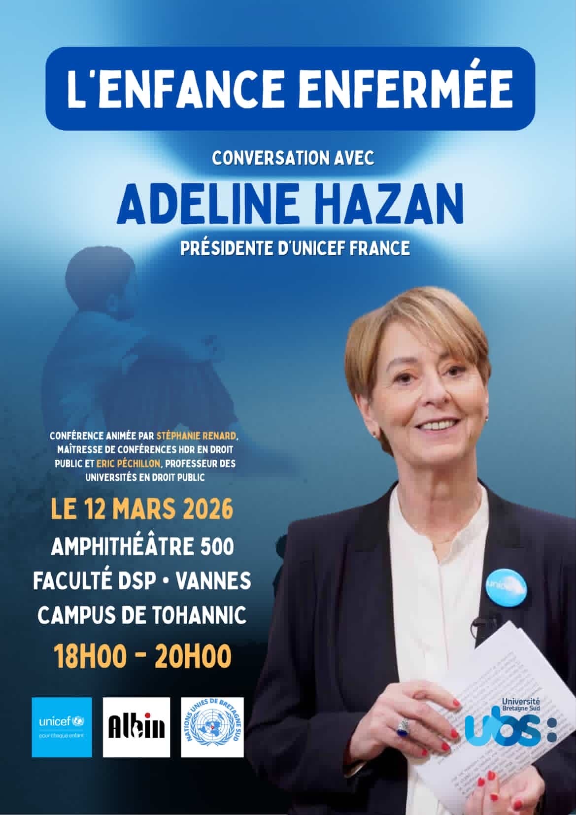 Dans le cadre d’un projet tutoré, des étudiants de la Faculté Droit & Science politique de l’Université Bretagne Sud organisent une conférence-débat intitulée « L’enfance enfermée », consacrée aux enjeux contemporains de l’enfermement des enfants en France. Engagés comme jeunes ambassadrices de l’UNICEF, membres de l’association Albin et de Nations Unies Bretagne Sud, ils portent collectivement cette initiative à la croisée de l’engagement citoyen et de la réflexion juridique.