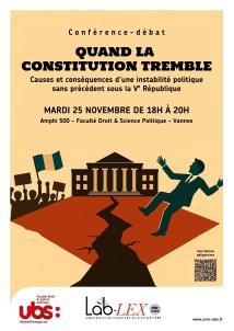 Conférence : causes et conséquences d’une instabilité politique sans précédentLa France tremble, sa Constitution aussi. Une conférence, le mardi 25 novembre de 18h à 20h, à Vannes, pour comprendre comment nos institutions se retrouvent au cœur de la tempête politique.