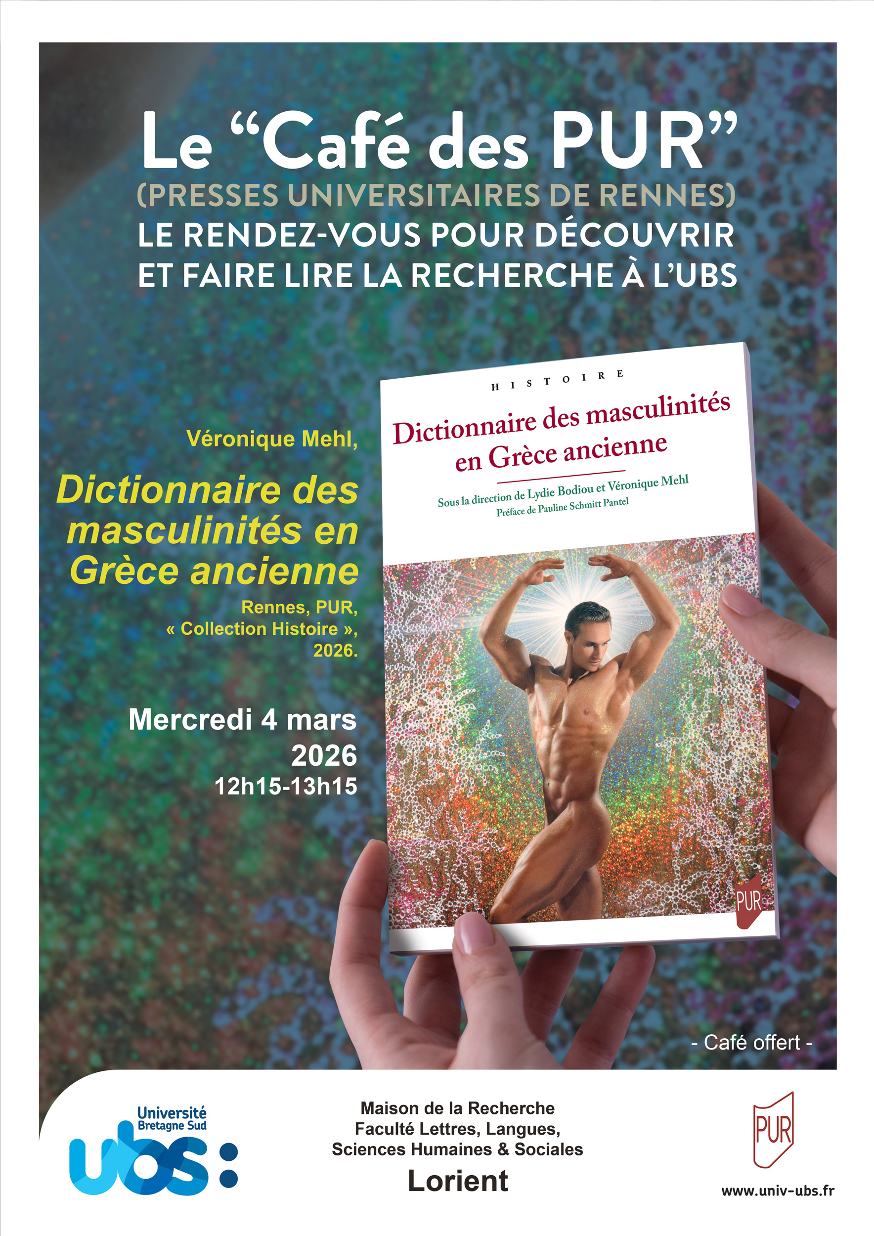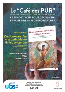 Pour ce nouveau rendez-vous du « Café des PUR », venez rencontrer Véronique Mehl, maîtresse de conférences en histoire à l’Université Bretagne Sud et autrice de l’ouvrage Le Dictionnaire des masculinités en Grèce ancienne paru en 2026 aux Presses Universitaires de Rennes, « Collection Histoire ».