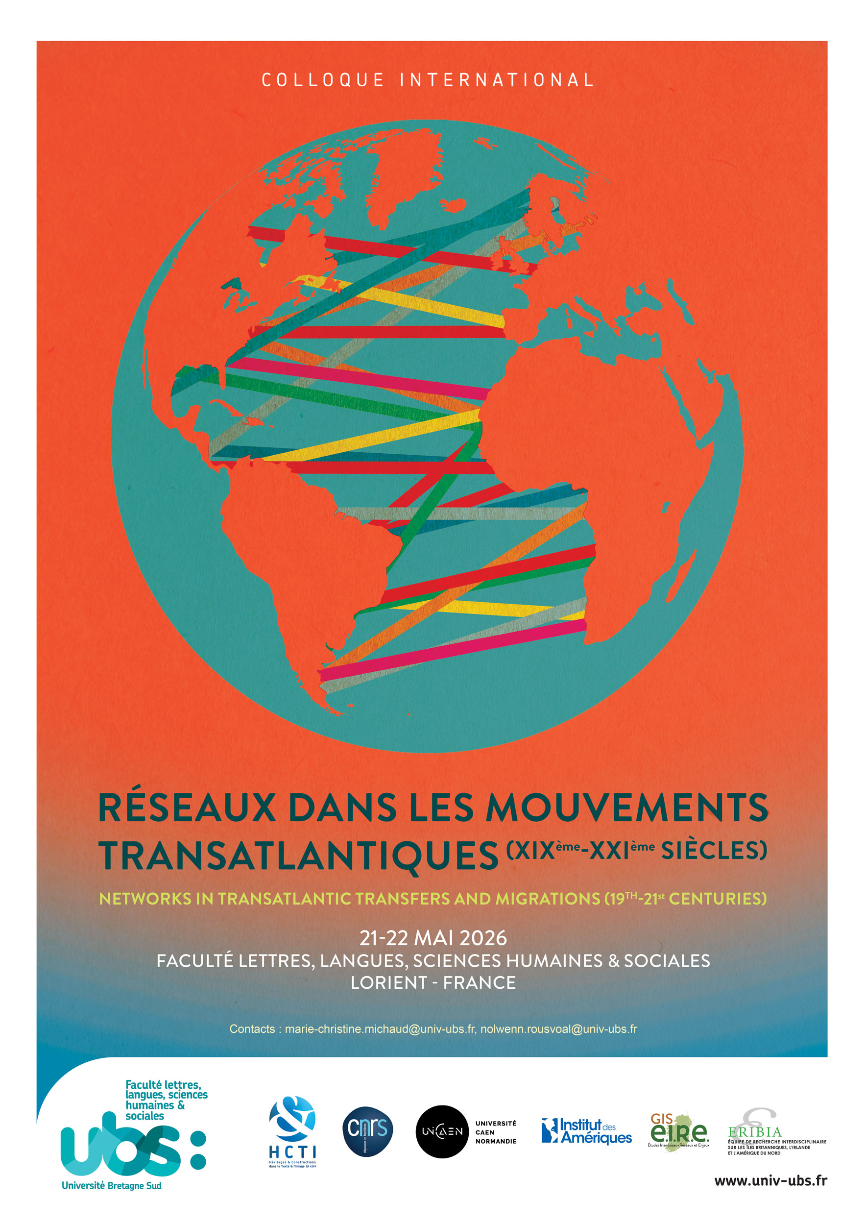 Colloque international - Réseaux dans les mouvements transatlantiques Les 21 et 22 mai 2026, l’Université Bretagne Sud accueille un colloque international consacré aux réseaux et mobilités transatlantiques. Chercheurs internationaux analyseront migrations, diasporas et circulations entre Europe, Afrique et Amérique du Nord.