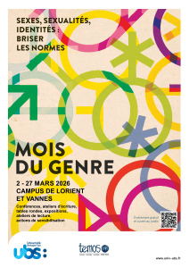 Le Mois du GenreLe Mois du genre revient à l’Université Bretagne Sud, du 2 au 27 mars 2026, avec une programmation toujours ouverte à toutes et tous. Conférences, expositions, spectacles, projections et rencontres… rythmeront le mois de mars pour briser les normes.