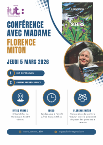 Florence Miton de retour à l’IUT de Vannes : une rencontre autour de son roman SoeursAncienne enseignante en communication à l’IUT de Vannes, Florence Miton sera présente le jeudi 05 mars à partir de 16h30 pour un moment d’échanges ouvert aux étudiants comme au grand public, autour de son tout premier livre bouleversant Soeurs.