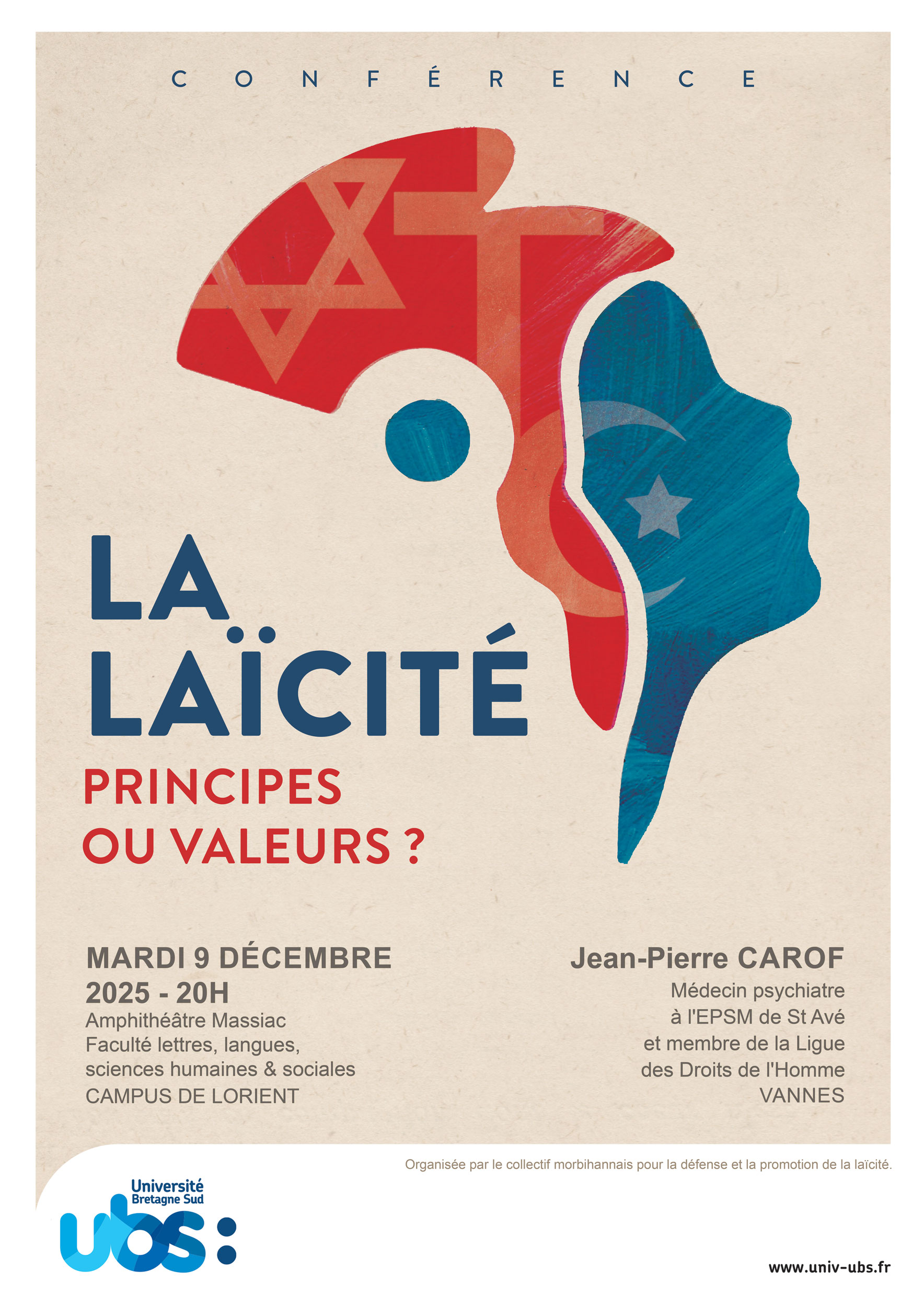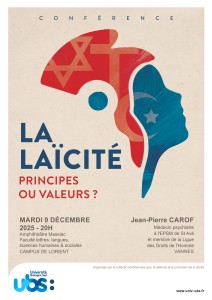 Conférence - La Laïcité : principes ou valeurs ?Participez à la conférence « La laïcité : principes ou valeurs ? » le 9 décembre à 20h à la Faculté des Lettres (UBS). Avec le collectif morbihannais, explorez ses racines, ses enjeux et son rôle pour la liberté de conscience et le vivre-ensemble.