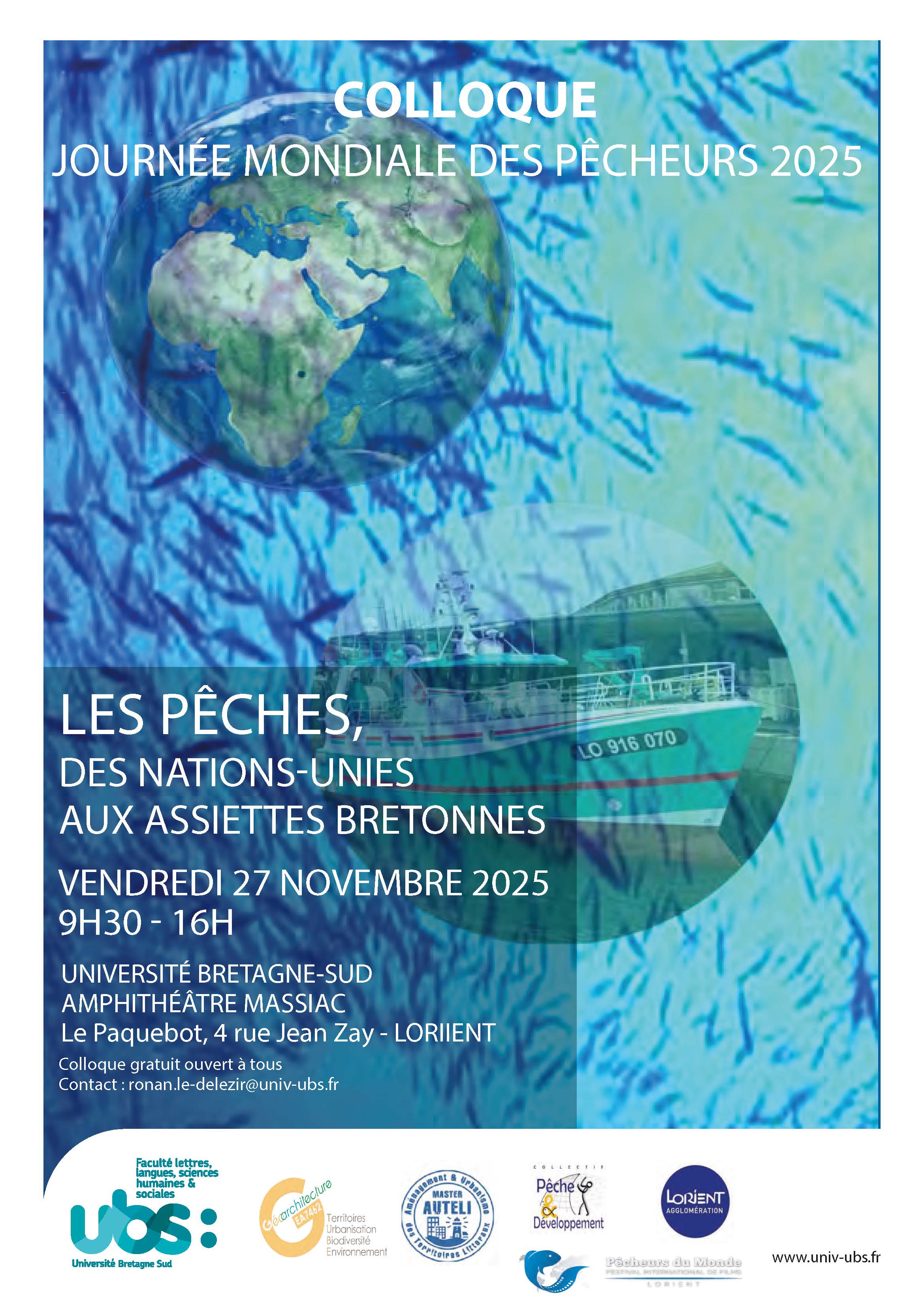 Journée Mondiale des Pêcheurs 2025 : les pêches des Nations Unies aux assiettes bretonnesLe vendredi 27 novembre 2025, la Faculté Lettres, Langues, Sciences Humaines & Sociales de Lorient accueillera un colloque qui mettra en lumière le rôle essentiel des pêcheurs dans la préservation des océans et les transitions écologiques.