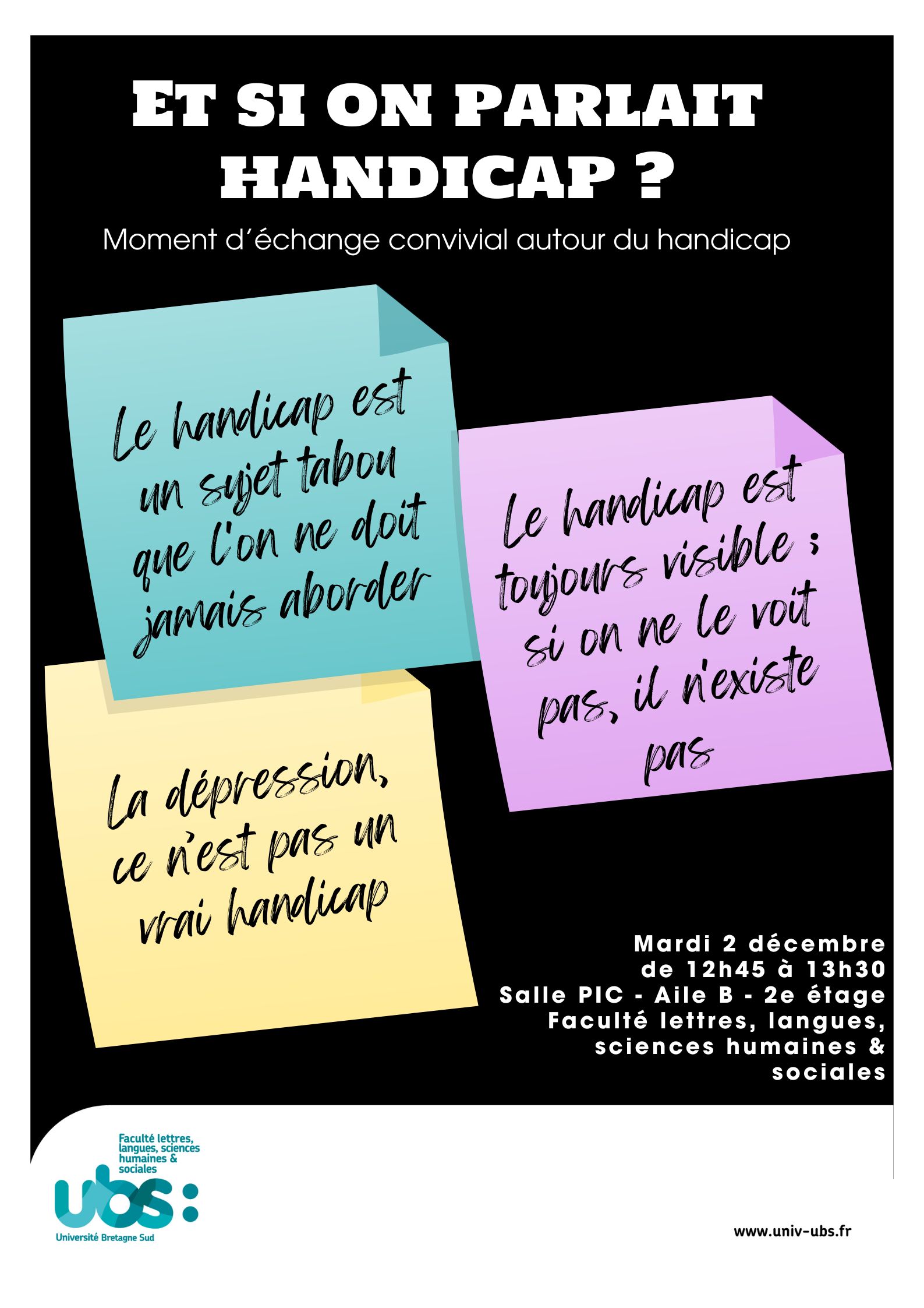 Temps d’échange « Et si on parlait handicap ? »Un rendez-vous pour partager, témoigner, échanger autour du handicap et des idées reçues le mardi 2 décembre de 12h45 à 13h30, à la Faculté lettres, langues, sciences humaines & sociales à Lorient.