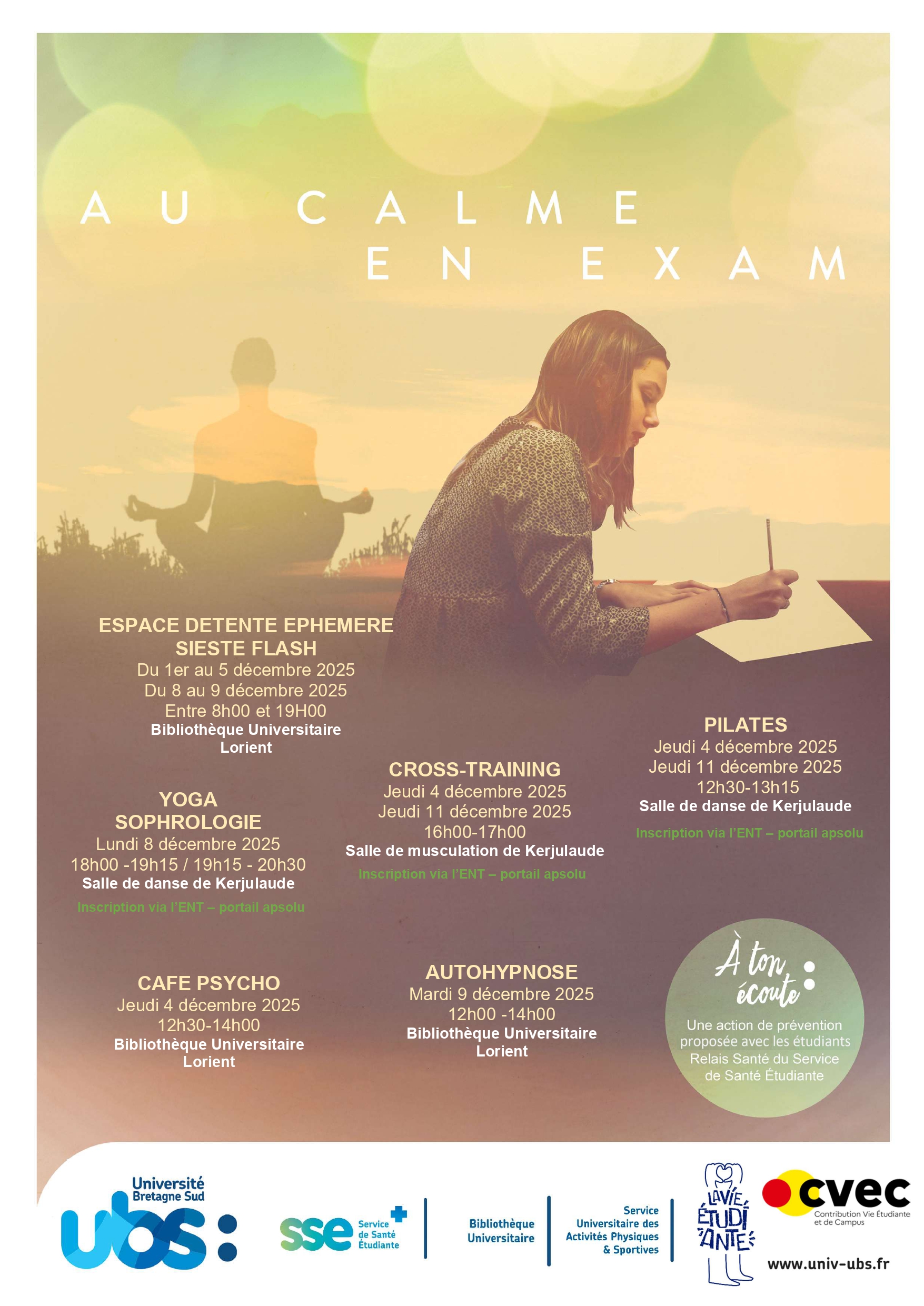 Au calme en examPour accompagner les étudiant·e·s durant la période d’examens, le Service de Santé des Étudiants (SSE), le Service Universitaire des Activités Physiques et Sportives( SUAPS) et la Bibliothèque Universitaire (BU) proposent une série d’activités favorisant le bien-être et la gestion du stress.
