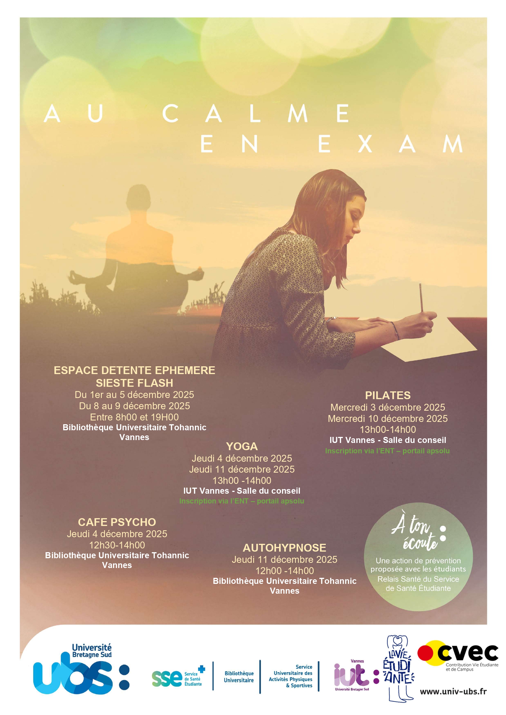 Au calme en examPour accompagner les étudiant·e·s durant la période d’examens, le Service de Santé des Étudiants (SSE), le Service Universitaire des Activités Physiques et Sportives( SUAPS) et la Bibliothèque Universitaire (BU) proposent une série d’activités favorisant le bien-être et la gestion du stress.