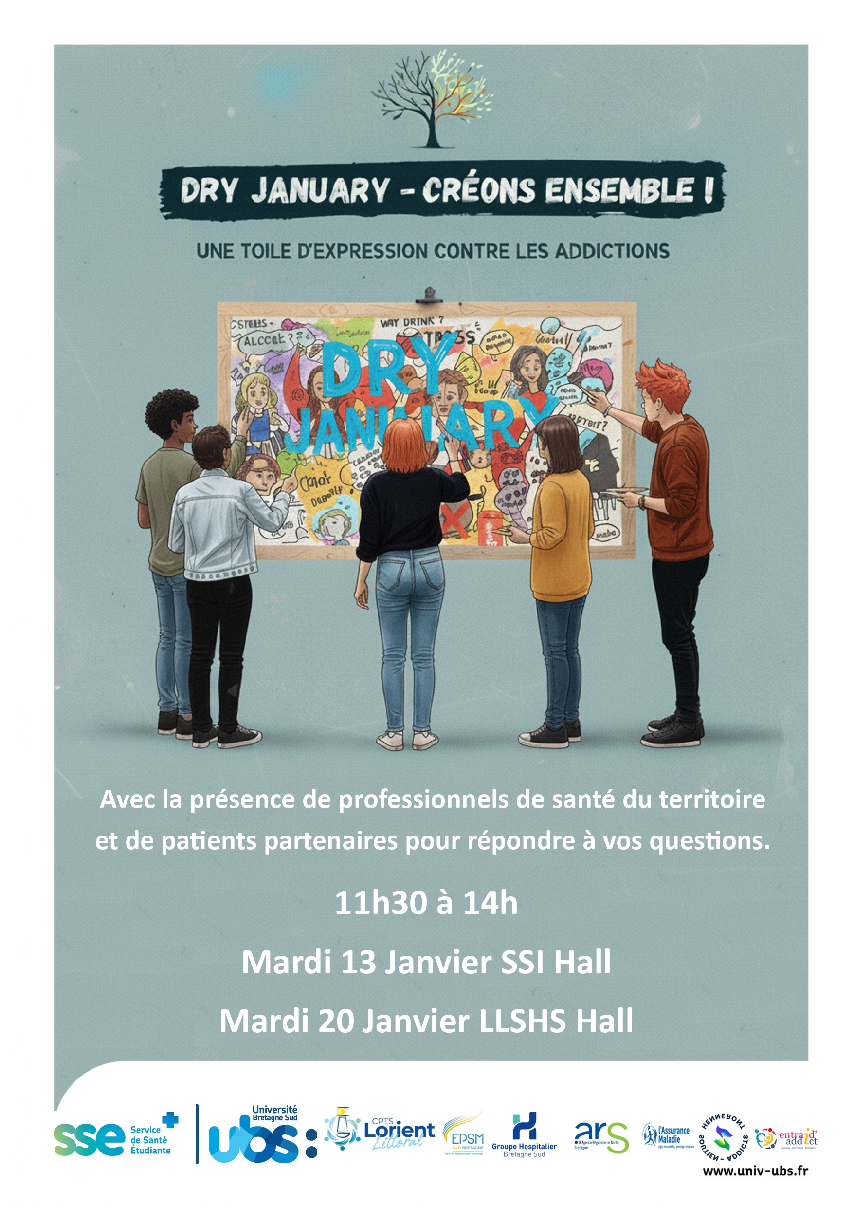 Dry January : une action de sensibilisation autour de la consommation d’alcool sur le campus de Lorient.La communauté professionnelle territoriale de santé (CPTS) de Lorient Littoral, en partenariat avec le Service de Santé des Étudiants de l’UBS, propose une action de sensibilisation autour de la consommation d’alcool, à Lorient le 13 janvier, afin d’encourager la réflexion, l’information et le déba grâce à une toile d’expression participative.