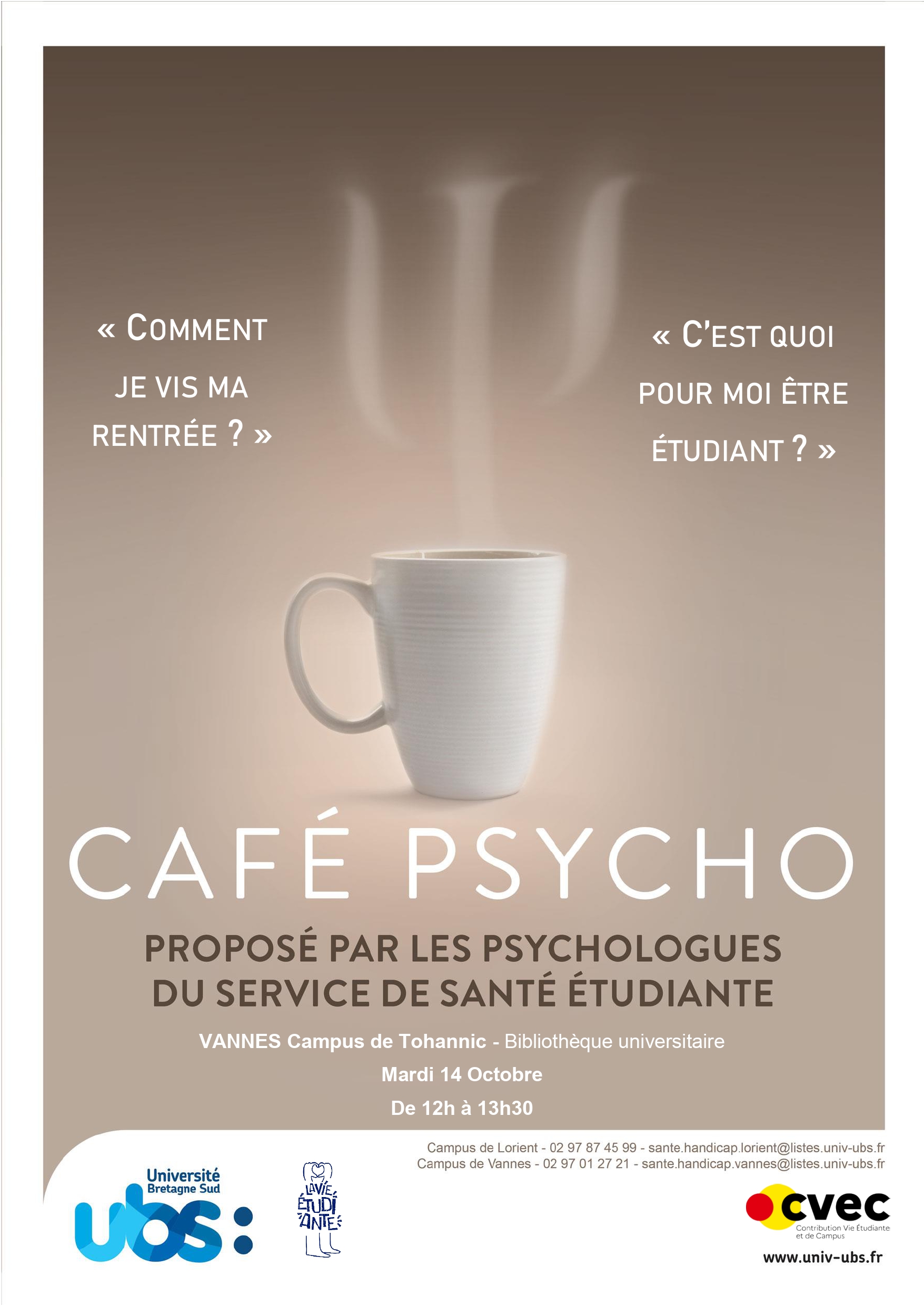 Café psychoLes psychologues du Service de Santé Etudiante proposent un Café Psycho à la BU de Vannes pour échanger avec les étudiant·es sur leur rentrée le 14 octobre à Vannes.