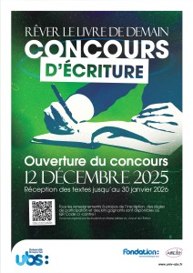 Concours d’ecriture - Rêver le livre de demain Les étudiants du Master Métiers du livre et de l’édition et l’Association Amedo proposent aux étudiants de l’Université Bretagne Sud un concours d’écriture sur le thème « Rêver le livre de demain ». Vous avez jusqu’au 30 janvier 2026 pour envoyer vos textes (2 pages maximum). Tous à vos plumes !