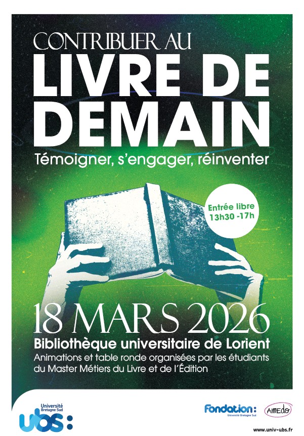 Dans le cadre de leur Master Métiers du Livre et de l’Édition, les étudiants de première année organisent une demi-journée du livre le mercredi 18 mars après-midi à la bibliothèque universitaire de Lorient. Le thème portera sur le livre de demain.