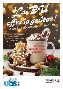 La BU vous invite au goûter de NoëlLa fin des examens arrive, les fêtes de fin d'année approchent... Pour fêter cette période, les BU de Lorient et Vannes invitent les étudiants à un moment convivial autour d'un goûter savoureux le jeudi 18 décembre entre 15h et 16h dans vos BU préférées.