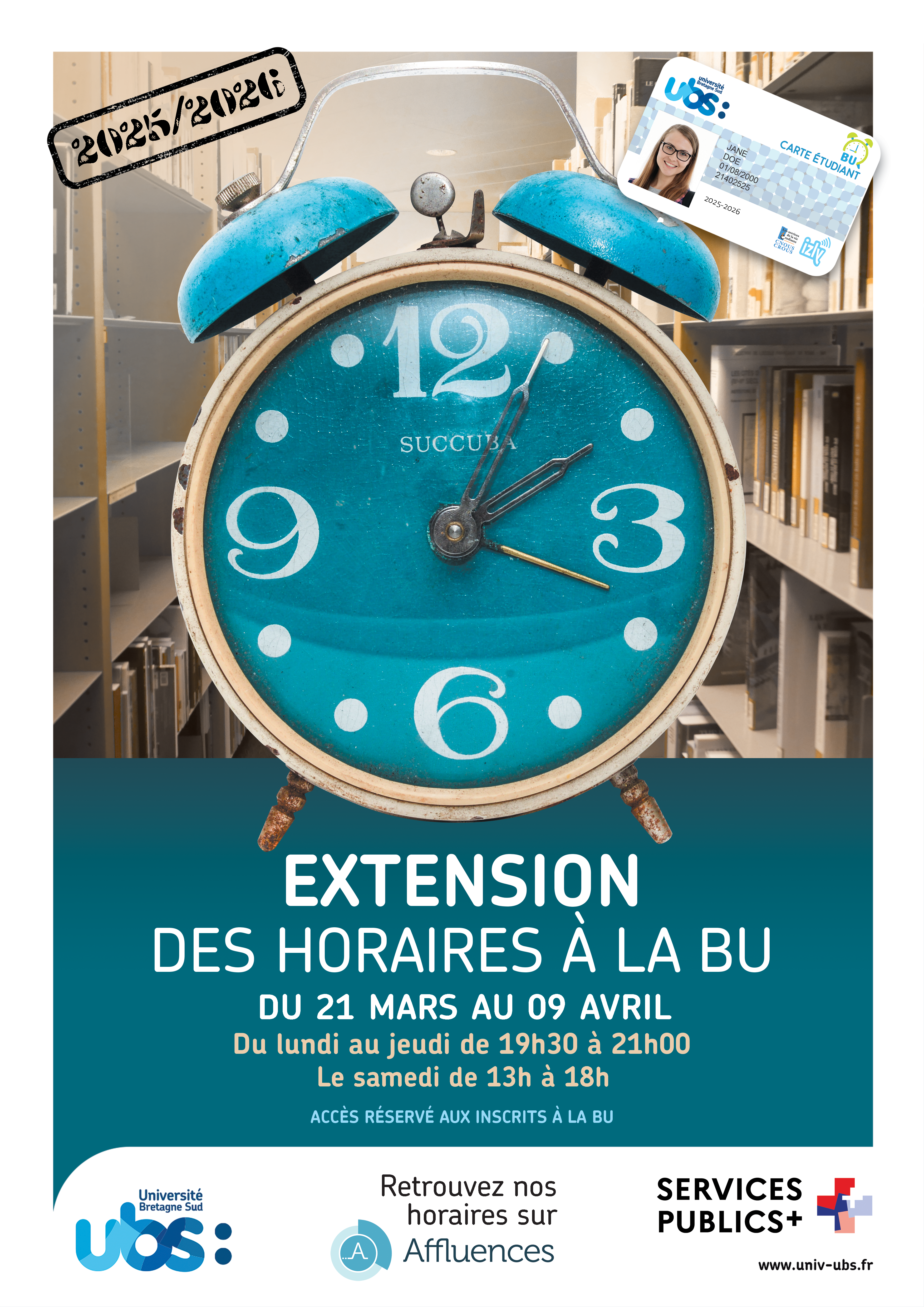 Besoin d'un endroit calme et stimulant pour travailler ? Les BU sont là pour vous et ouvrent le soir et le samedi en période de révisions.En période de révisions, les bibliothèques des campus de Vannes-Tohannic et de Lorient vous proposent un accès à leurs espaces de travail connectés le soir et le samedi après-midi. Profitez-en, les horaires étendus c'est du samedi 21 mars jusqu'au jeudi 9 avril 2026. Pour en bénéficier, pensez à vous munir de votre carte de lecteur que vous présenterez à l’entrée de la BU.