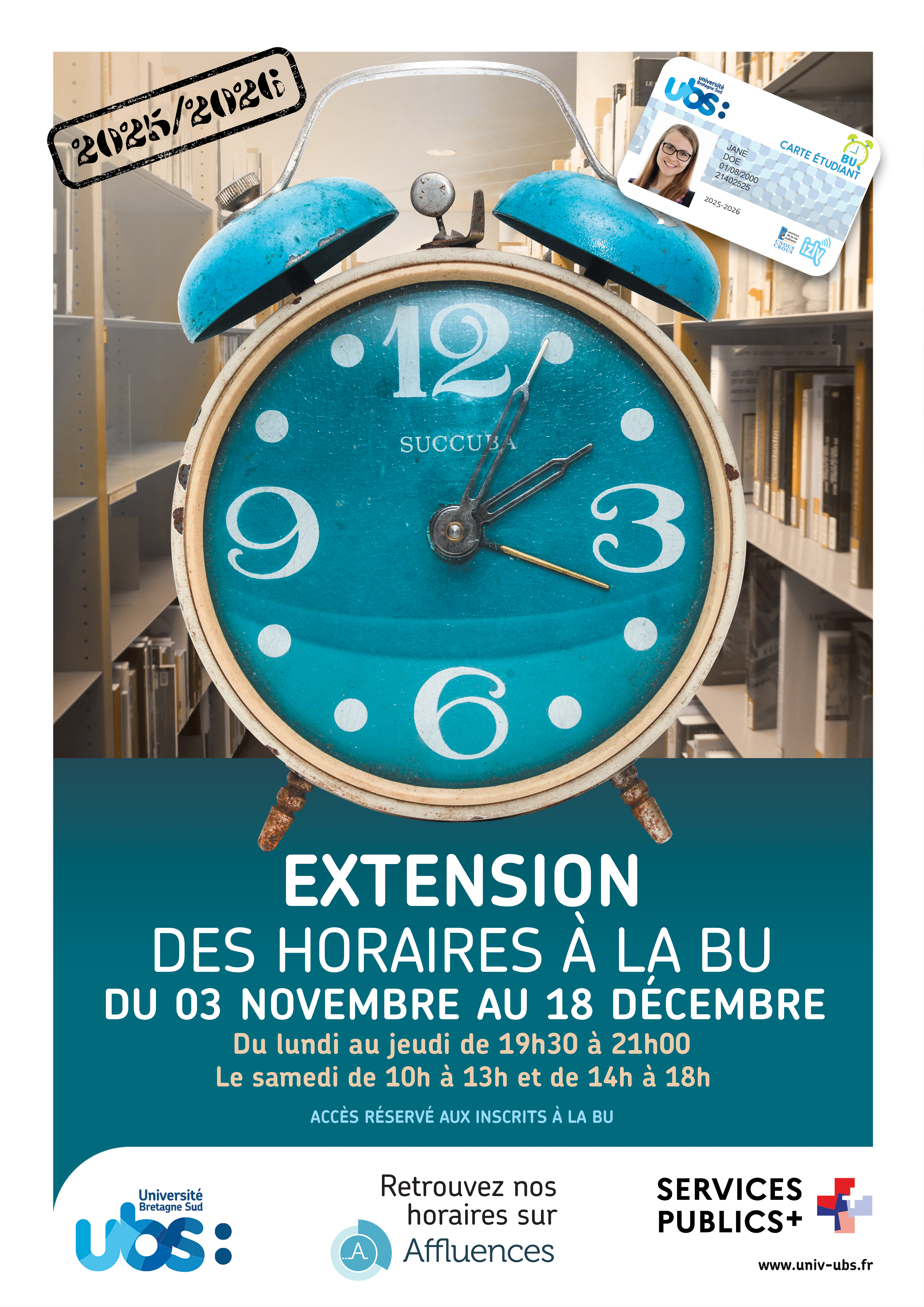 Révisions d'examens : la bibliothèque universitaire étend ses horaires le soir et le samedi !En périodes de révisions, les bibliothèques des campus de Vannes-Tohannic et de Lorient vous proposent un accès à ses espaces de travail connectés le soir et le samedi. Profitez-en, les horaires étendus c'est du lundi 3 novembre jusqu'au jeudi 18 décembre 2025. Pour en bénéficier, pensez à vous inscrire à la BU.
