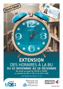 Au-delà de 19h30, les BU seront donc ouvertes du lundi au jeudi jusqu'à 21h et le samedi de 10h à 13h et de 14h à 18h00.