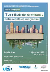 « Territoires croisés : entre réalité et imaginaire », une journée du livre organisée par les Masters Métiers du livre et de l'éditionLes étudiants en Master 1 des Métiers du Livre et de l’Édition fêtent la Nuit de la lecture autour du thème Villes et campagnes. Le 23 janvier, une table ronde accompagnée d'animations sera proposée à la Bibliothèque Universitaire de l’UBS. En parallèle, une exposition conçue à partir d'un appel à participation auprès des Lorientais sera présentée à la Médiathèque François Mitterand à Lorient.