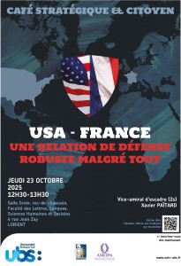 Café stratégique - Lorient - USA - France : une relation de défense robuste malgré toutLa conférence sera présentée par le Vice-amiral d'escadre (2s) Xavier Païtard, le jeudi 23 octobre à 12h30 à Lorient.