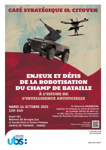 Café stratégique - Vannes - Enjeux et défis de la robotisation du champ de bataille à l’heure de l’intelligence artificielle. La conférence sera présentée par M. Gérard de BOISBOISSEL, ingénieur de recherche au Centre de Recherche de l'académie de Saint-Cyr Coëtquidan, le CReC Saint-Cyr. Directeur de l’observatoire Enjeux des Nouvelles Technologies pour les Forces, le mardi 14 octobre à 13h à Vannes.