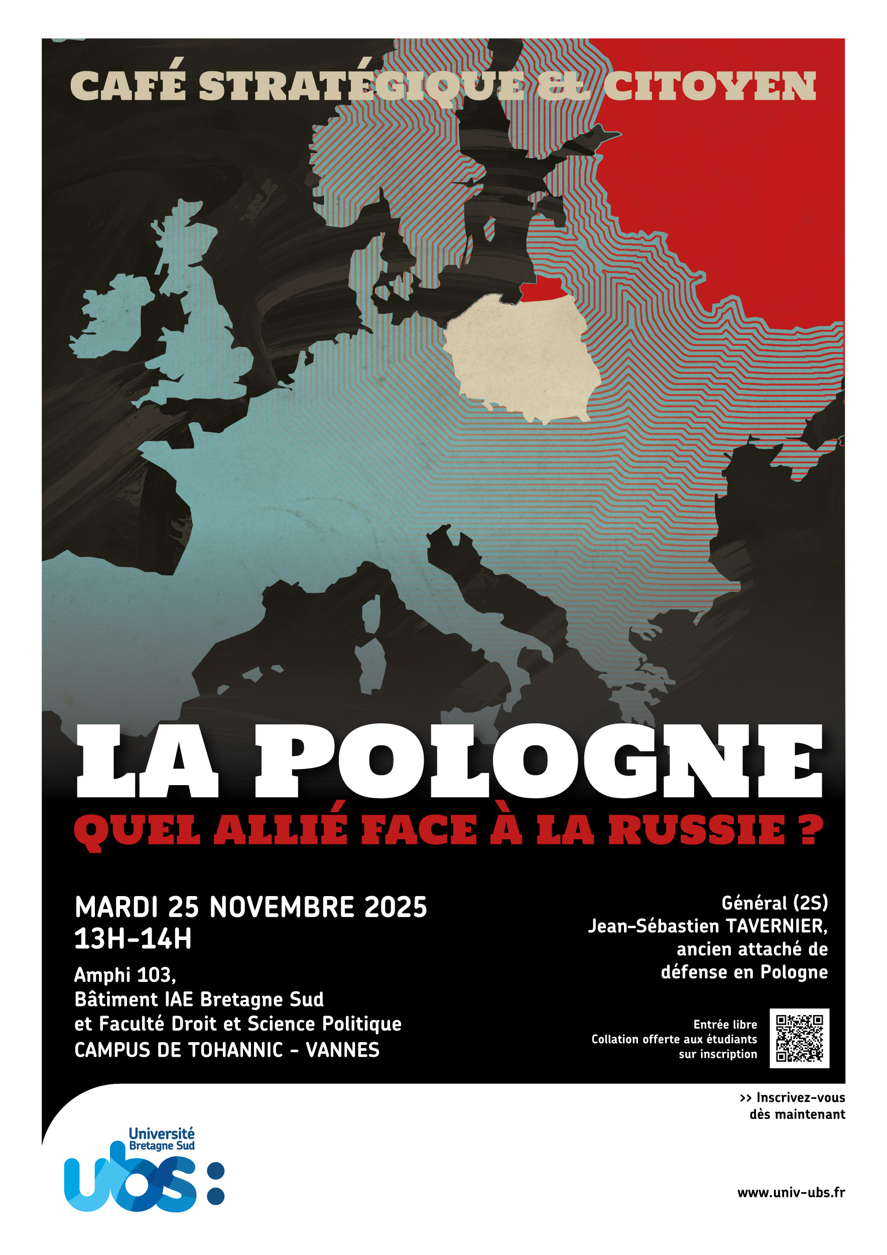 Café stratégique - Vannes - La Pologne, quel allié face à la Russie ? La conférence sera présentée par le général (2S) Jean–Sébastien TAVERNIER, ancien attaché de défense en Pologne, le mardi 25 novembre à 13h à Vannes.