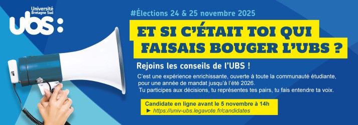 L’Université Bretagne Sud invite toute sa communauté étudiante à participer activement aux élections des conseils universitaires. Ces élections concernent le Conseil d’administration (CA), la Commission de la formation et de la vie universitaire (CFVU) – ainsi que les conseils de composantes (facultés, IUT, écoles). Ces instances jouent un rôle essentiel dans la vie de l’université : elles décident des orientations stratégiques, des offres de formation, des projets étudiants, et bien plus encore.