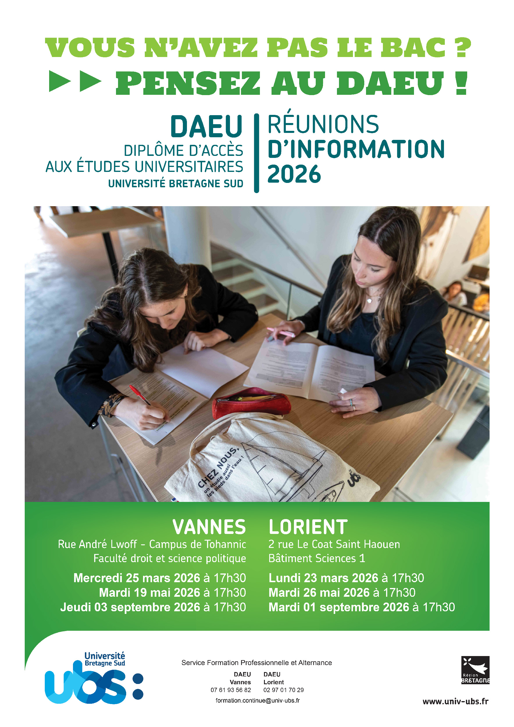 Tout savoir sur le DAEUVous n'avez pas le Bac : pensez au DAEU ! Réunion d'information le mercredi 25 mars à 17h30 à Vannes.