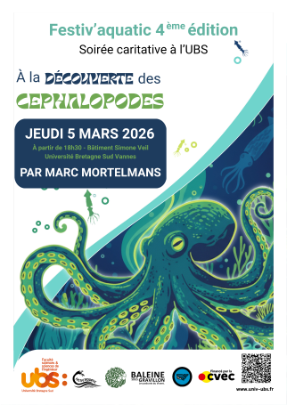 Marc Mortelmans, invité d'honneur du Festiv'Aquatic 2026Dans le cadre de l'édition 2026 du Festiv'Aquatic, organisé le jeudi 5 mars, Marc Mortelmans, viendra animer la conférence "À la découverte des céphalopodes », à l'Université Bretagne Sud.