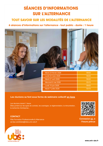 Tout savoir sur l'alternance à la Faculté des SciencesLe Pôle Formation Professionnelle et Alternance de la Faculté Sciences & Sciences de l'Ingénieur de l'Université Bretagne Sud propose aux étudiants intéressés, des séances d'informations en ligne sur l'alternance.
