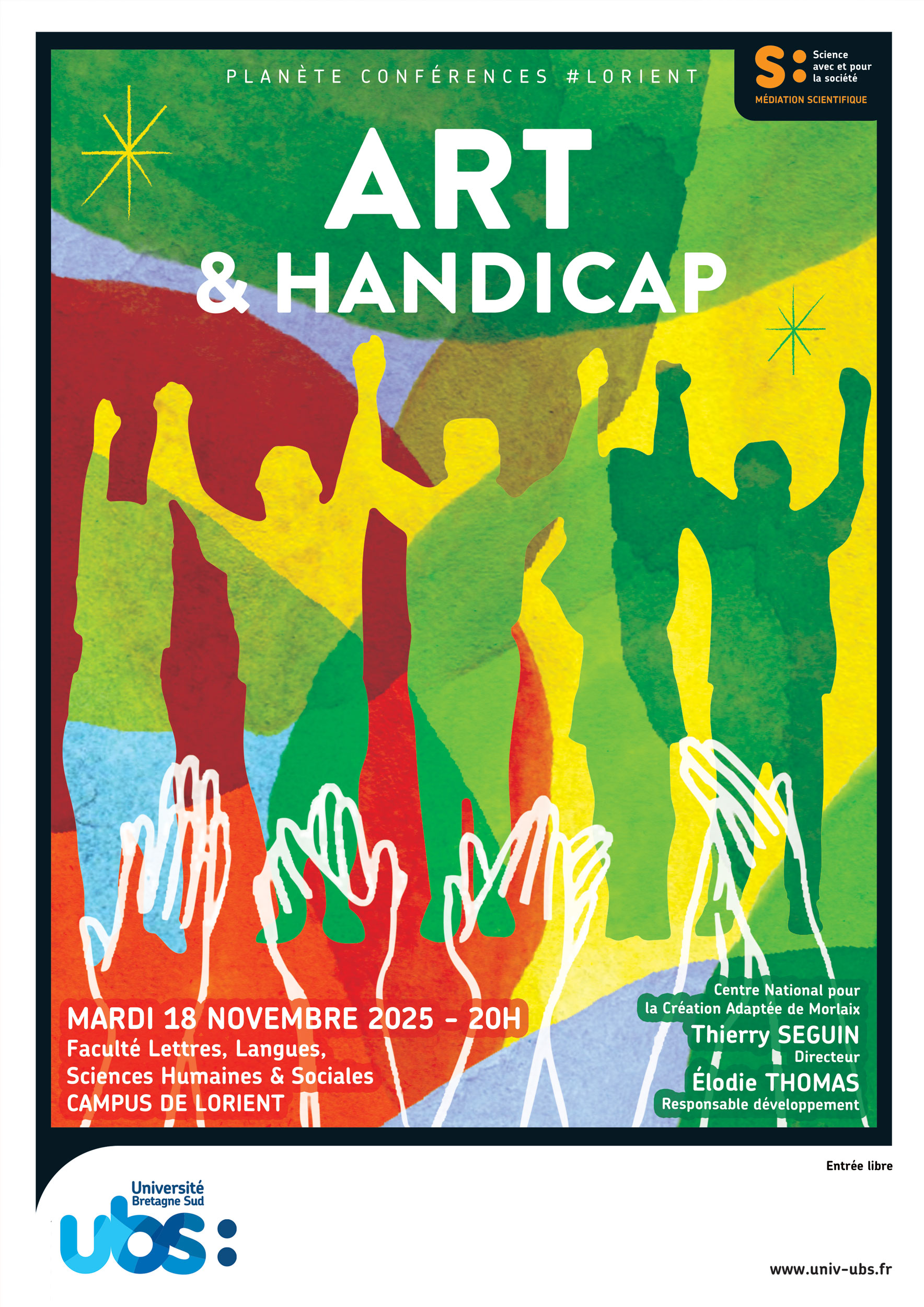 Planète conférences - Lorient - Art & handicapEt si l’art pouvait changer notre regard sur le handicap ? À travers l’exemple de l’art brut, le Centre National pour la Création Adaptée présentera son engagement pour une scène artistique plus inclusive. Mardi 18 novembre à 20h à la Faculté lettres, langues, sciences humaines & sociales.