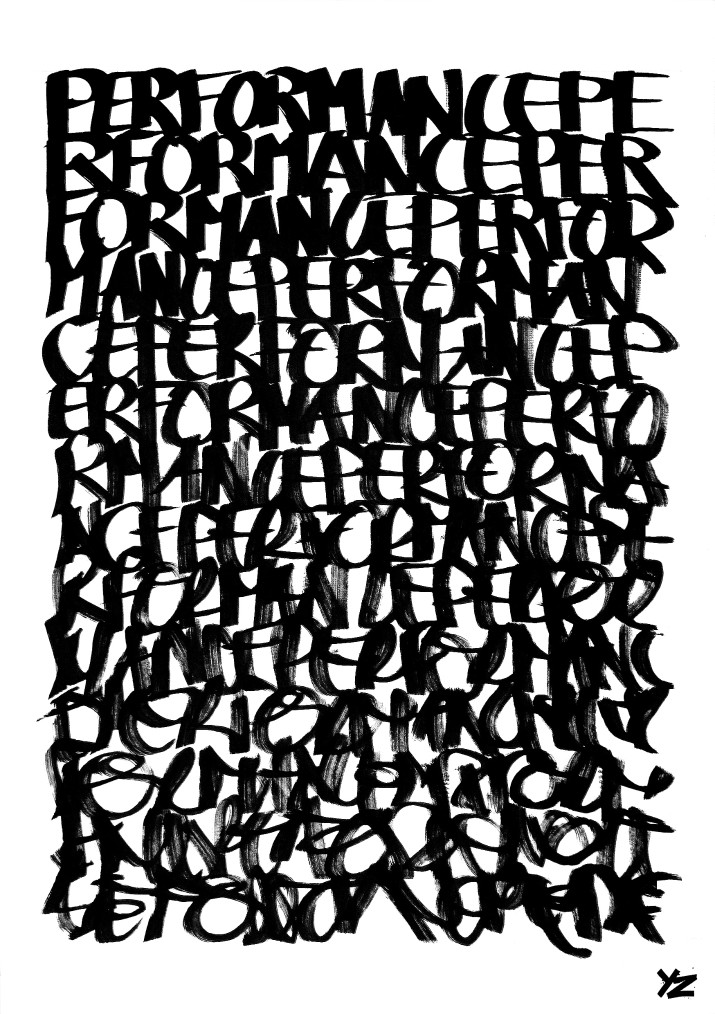 J’y écris ce mot au marqueur, de manière répétée, continue, jusqu’à ce que l’effort transforme le tracé : le mot se déforme, vacille, se recompose — comme un corps dans l’effort qui s’adapte, résiste et persiste. L’écriture devient mouvement et chaque lettre témoigne du processus plutôt que de la perfection. Cette pièce rappelle que performer n’est pas seulement atteindre une limite, mais éprouver le chemin, et laisser une trace du vivant en transformation." Yseult YZ Digan