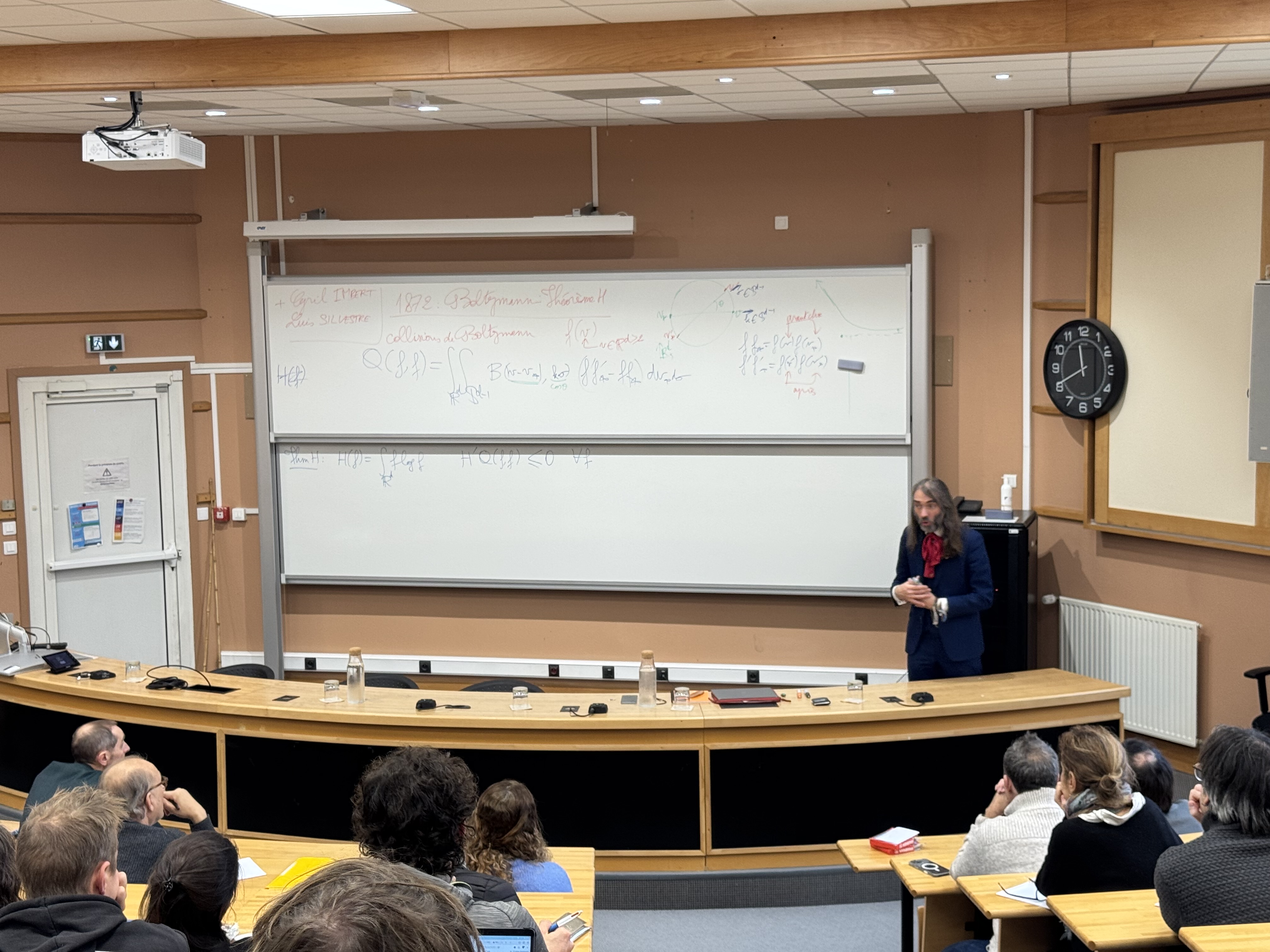 Cédric Villani a présenté un exposé intitulé : « Information de Fisher et collisions de Boltzmann ». Un titre exigeant, à la hauteur d’un travail théorique majeur, mené en collaboration avec Cyril Imbert et Luis Silvestre (mathématiciens de renommée internationale également) et qui vient clore une quête scientifique entamée il y a plus de soixante ans.